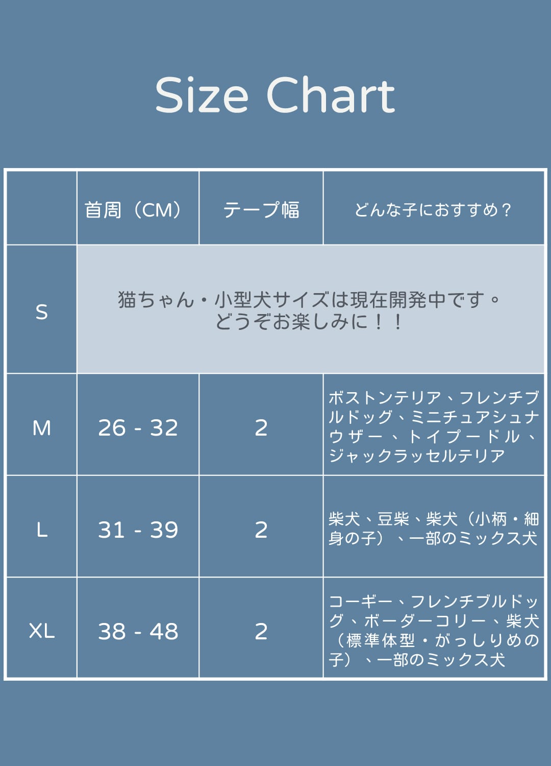 ※ご購入前に、必ず愛犬・愛猫の首回りをご確認のうえお買い求めください。サイズ表はあくまで目安です。